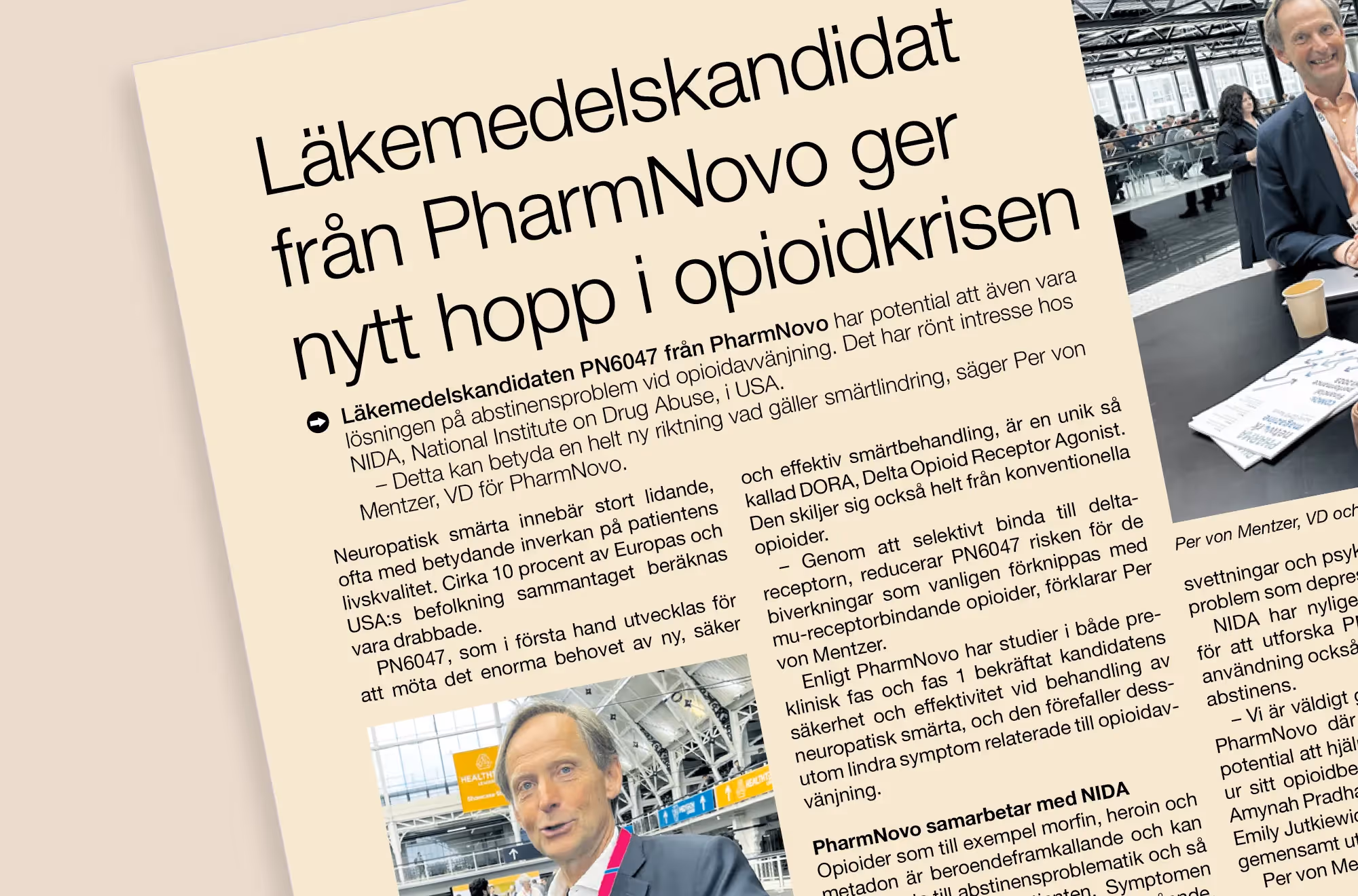 We are proud to share an article in Dagens Industri about our groundbreaking work with PN6047. Our promising drug candidate not only has the potential to revolutionise pain relief but has also caught the attention of the National Institute on Drug Abuse (NIDA) for its role in opioid withdrawal treatment. Per von Mentzer, our CEO, states: "Our work with PN6047 could open new paths in pain relief. Particularly in neuropathic pain, our research could lead to new insights and novel treatment approaches in various clinical areas." PN6047, a selective DORA, offers a new perspective on both pain management and opioid withdrawal treatment. The results from the Phase I study show promising safety and tolerance, paving the way for further studies on its effects on opioid withdrawal syndrome.